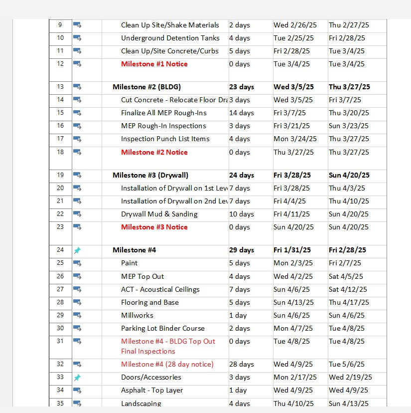 - Milestone Management: Track key milestones like Site Preparation, Building Top-Out, Drywall Completion, and more.
