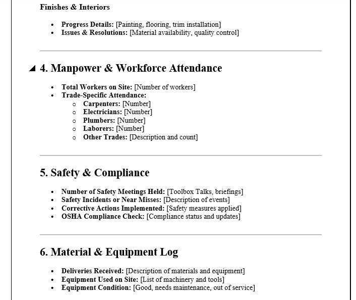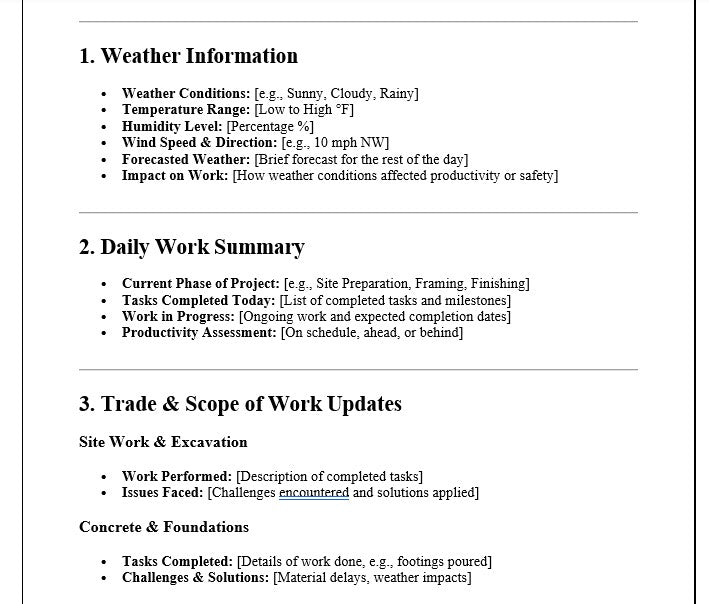 - Detailed Reporting Sections: Includes Daily Work Summary, Trade-Specific Updates, Safety & Compliance, Material & Equipment Logs, and Weather Information.