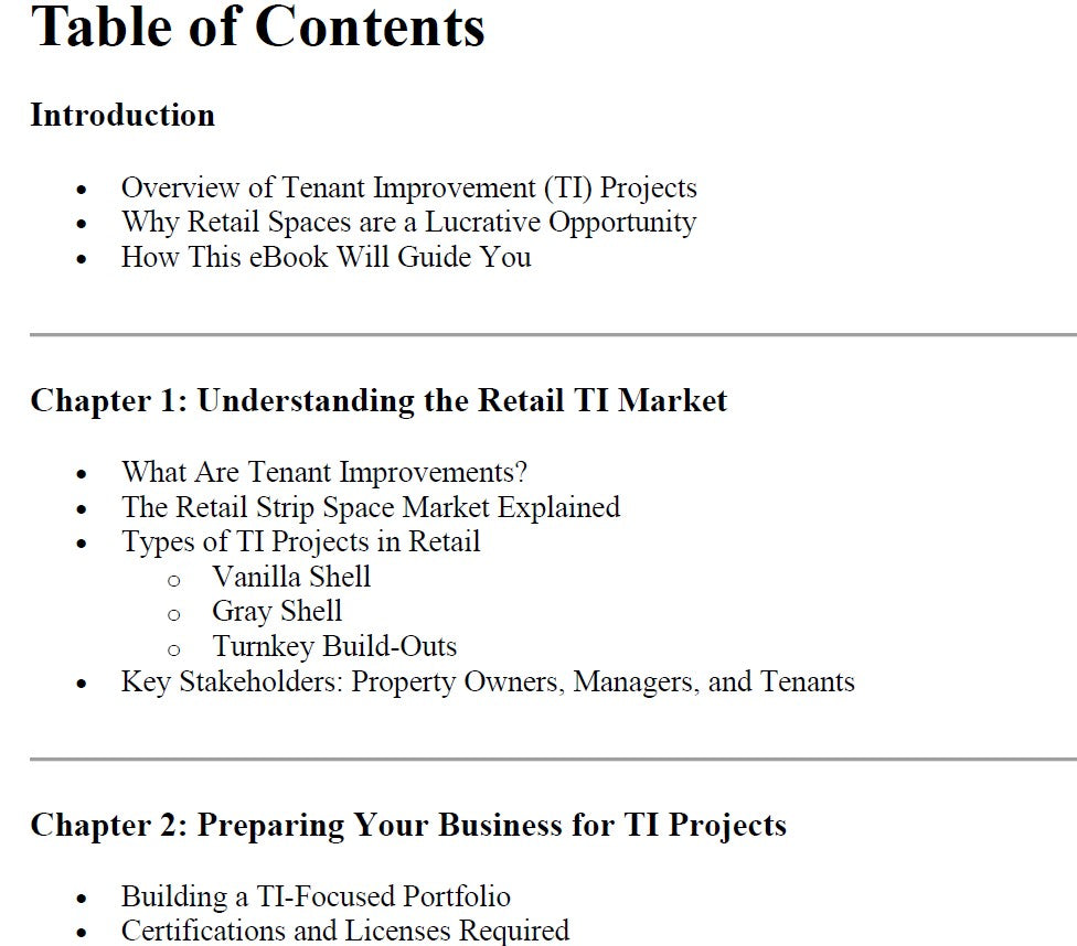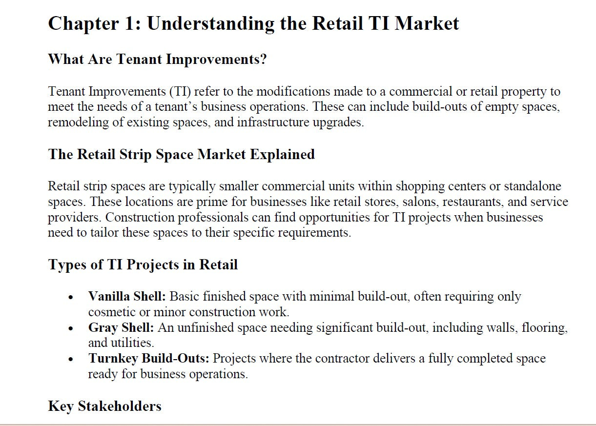This eBook will guide you through every step of entering the retail TI market, from understanding industry dynamics to securing projects and executing successful build-outs.