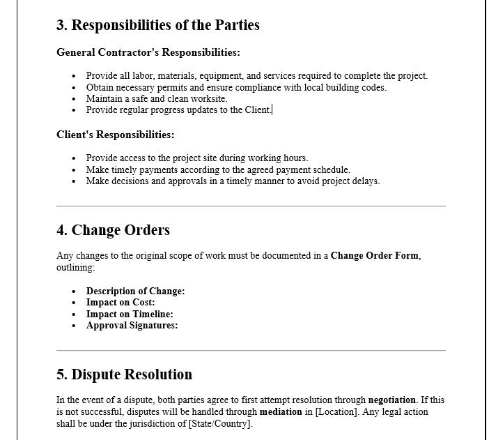 - Comprehensive Contract Structure: Covers all critical aspects, including Scope of Work, Payment Terms, Timelines, Responsibilities, and Legal Protections.