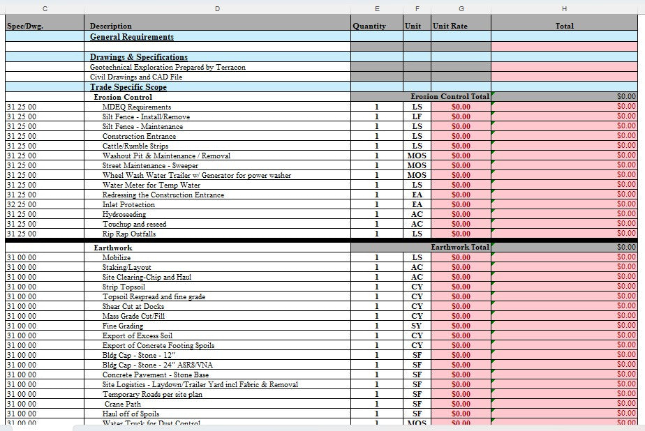 - Comprehensive Cost Breakdown: Covers every detail, including General Requirements, Erosion Control, Earthwork, and more.