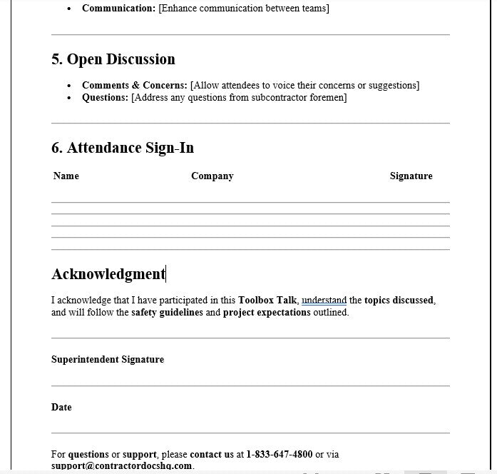 - Recordkeeping & Accountability: Include sign-in sheets for attendees, ensuring documented participation in safety talks.